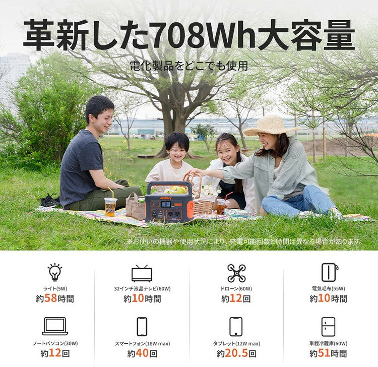 【商品説明】?キャンプ、災害時に2〜3日使用できる大容量ポータブル電源「Jackery ポータブル電源 708」は、191400mAh/708Whの大容量のため、キャンプや車中泊、災害時の緊急電源として2〜3日程度使用することができます。
