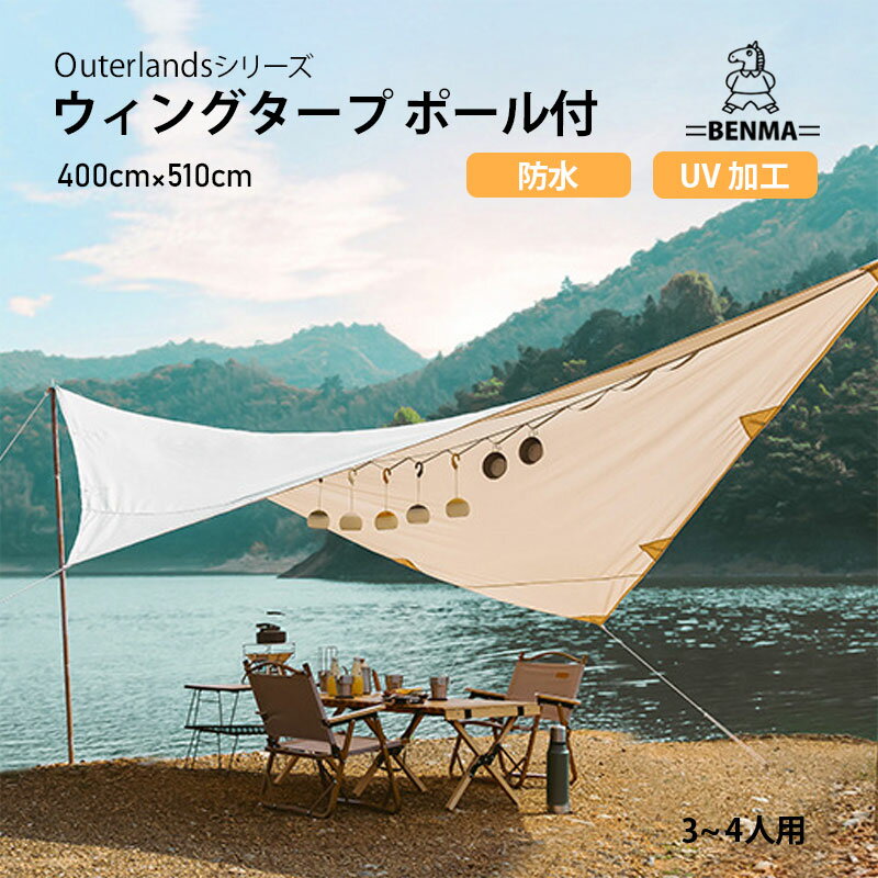 【送料無料】高耐水圧 ウィングタープ ポール付 4m x 5.1m 【 Outerlands シリーズ 】 シンプル デザイン おしゃれ キャンプ 折り畳み コンパクト 外遊び バーベキュー BBQ レジャー タープ 4m テント ウィング テントタープ 簡単 uvカット uv加工 紫外線 防水
